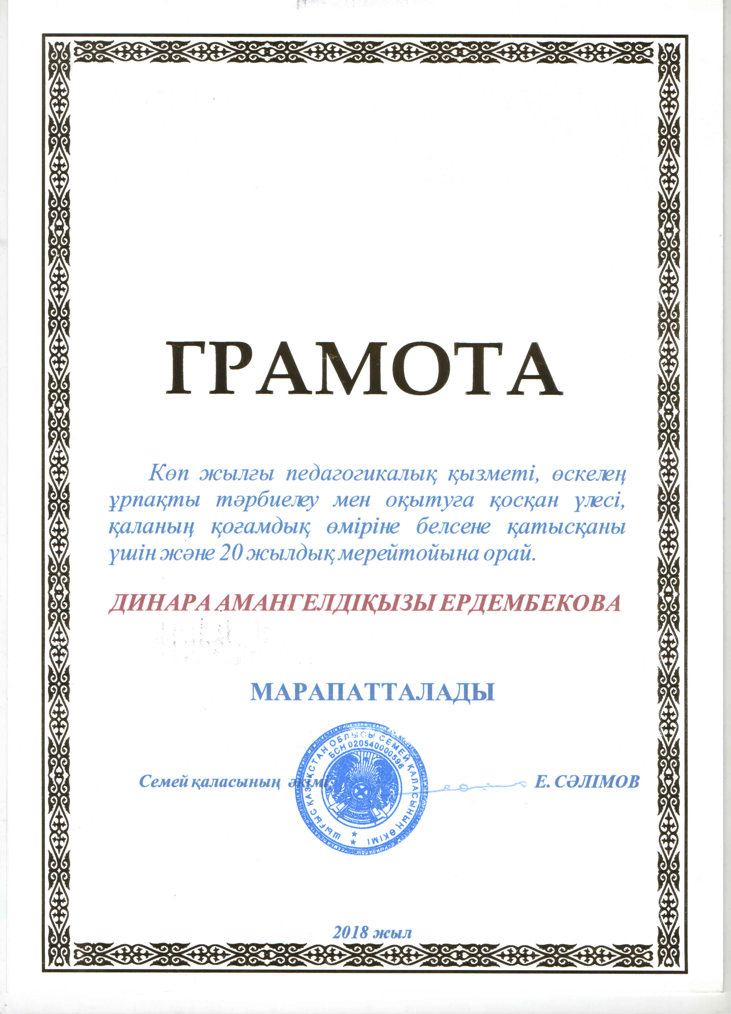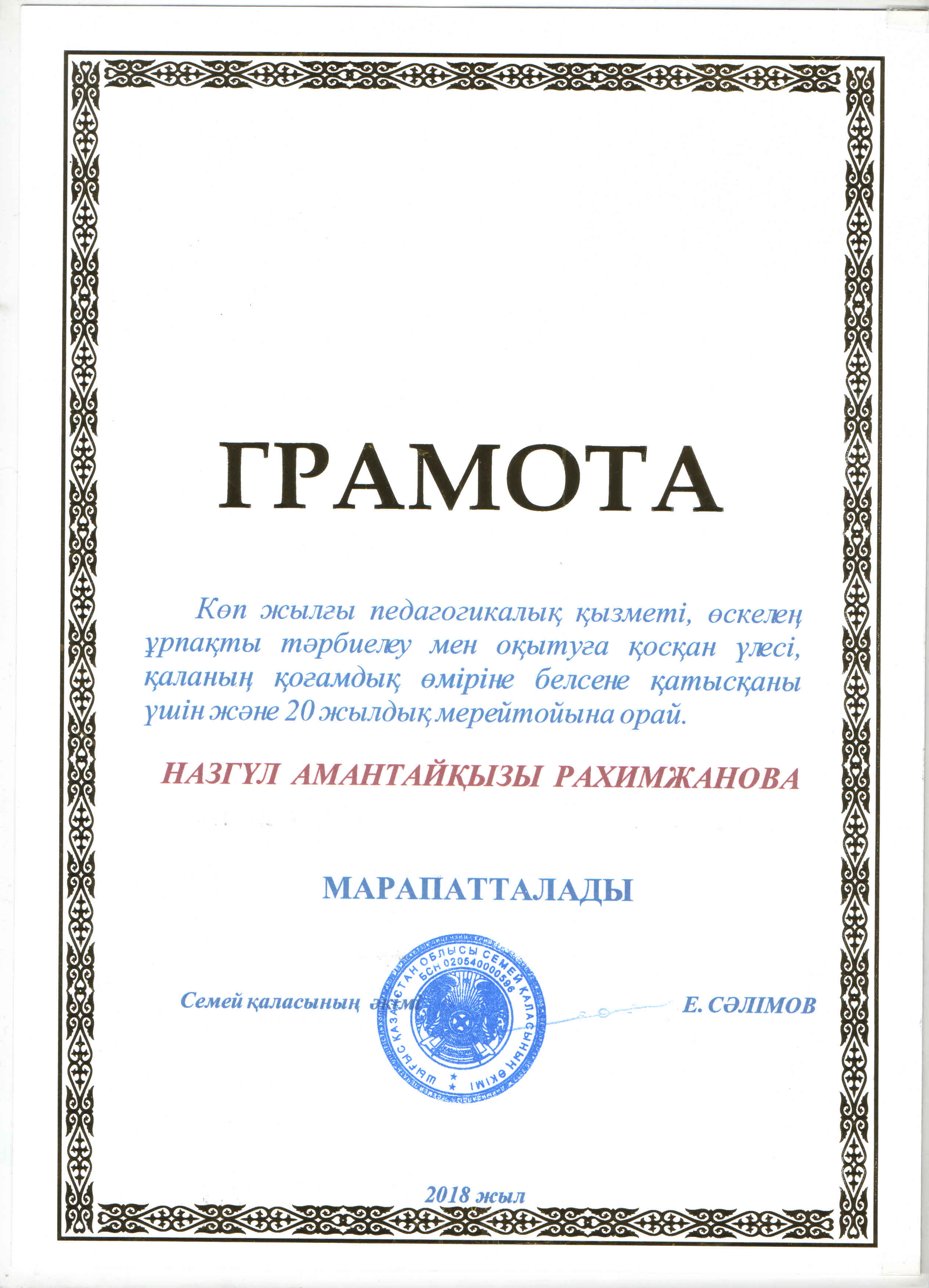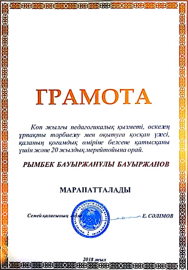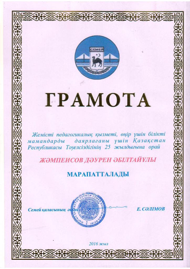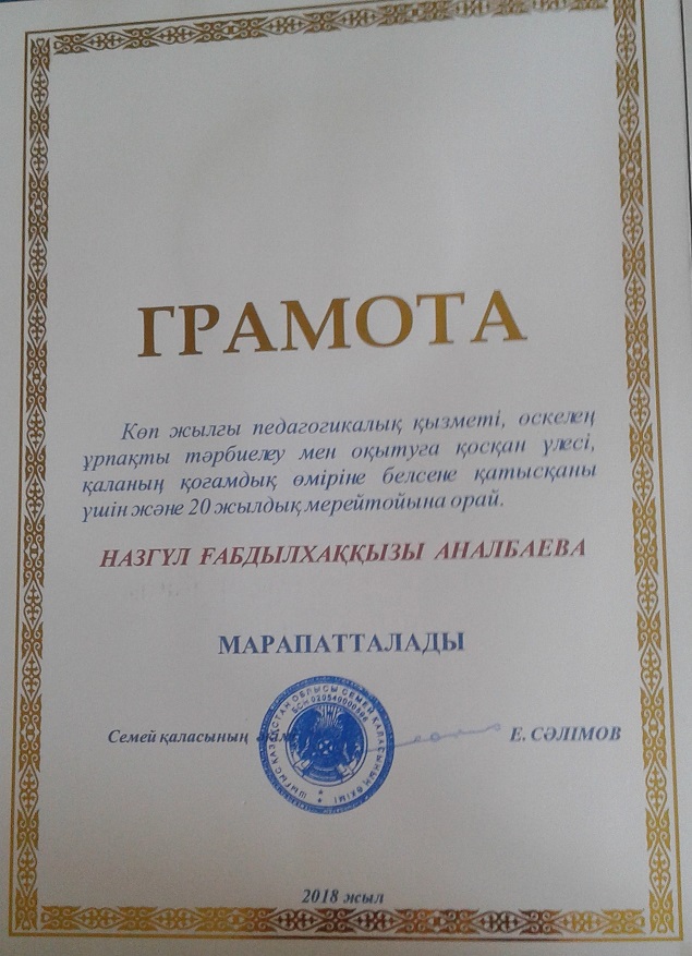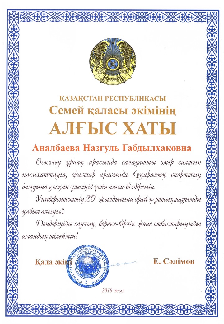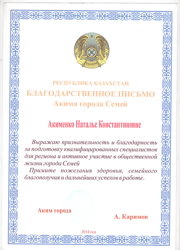 БЛАГОДАРСТВЕННОЕ ПИСЬМО АКИМА ГОРОДА СЕМЕЙ