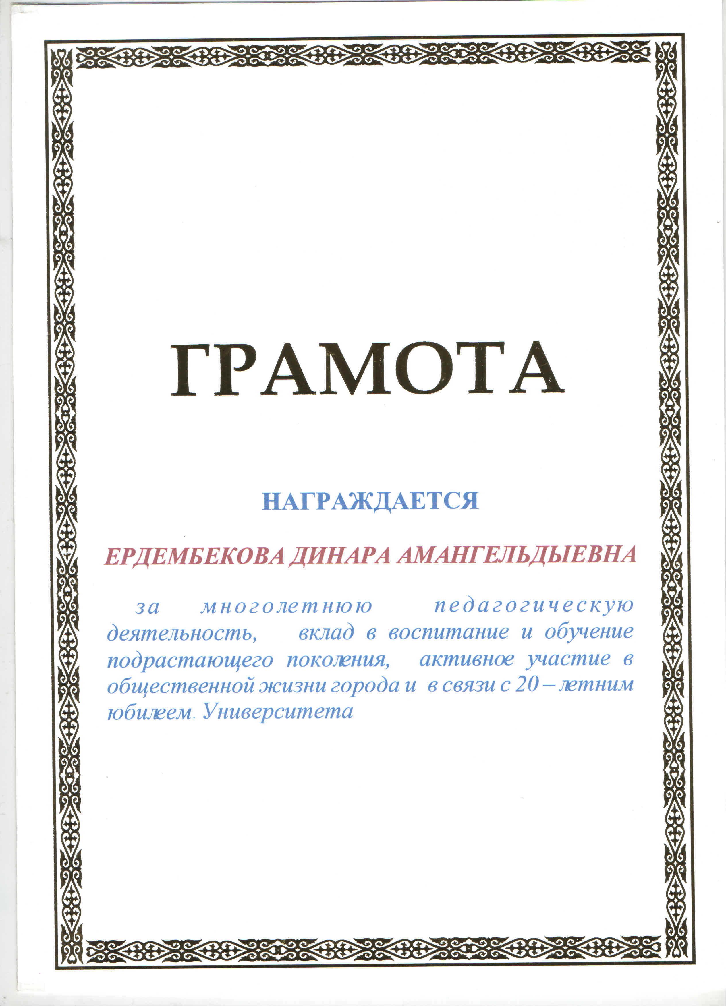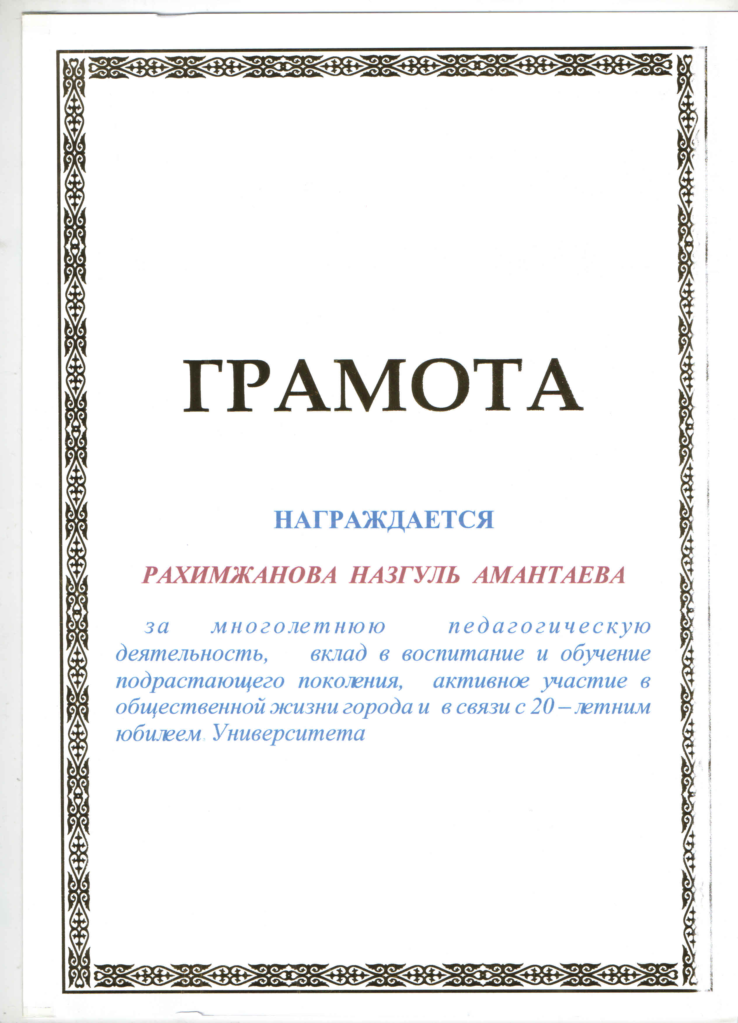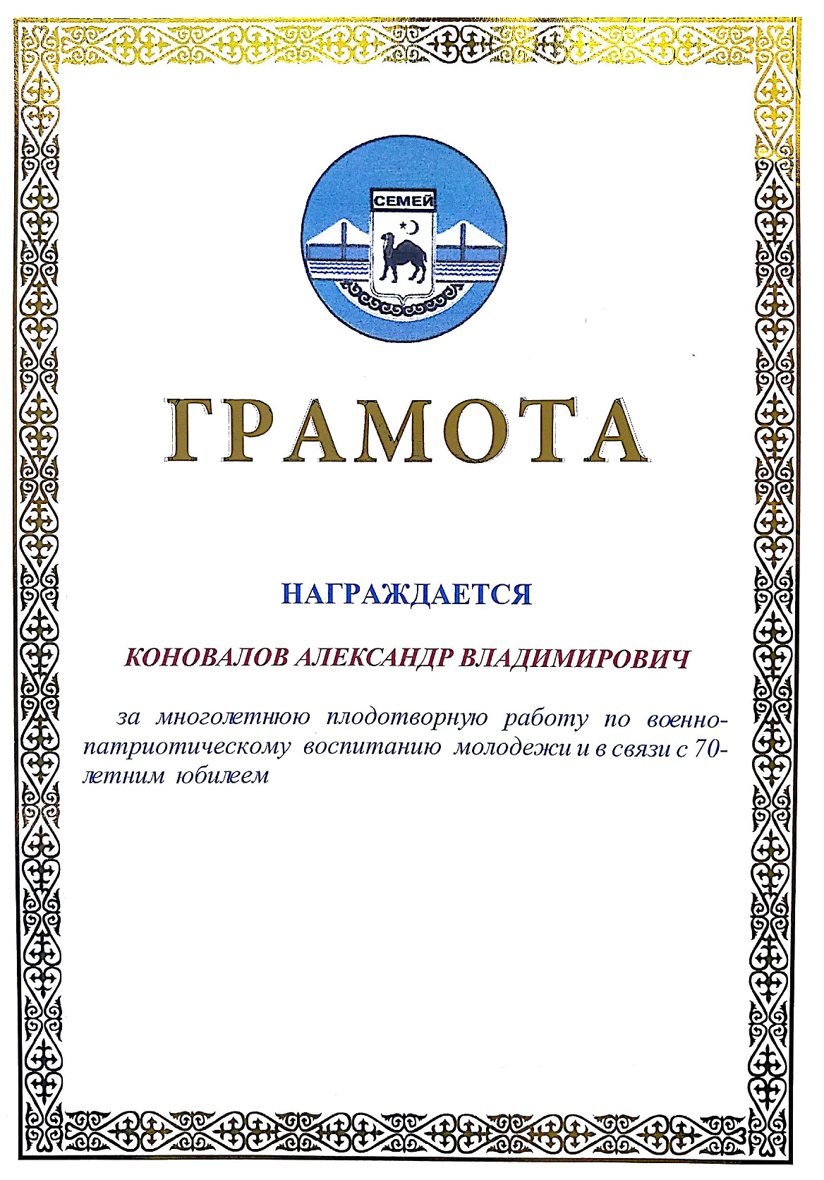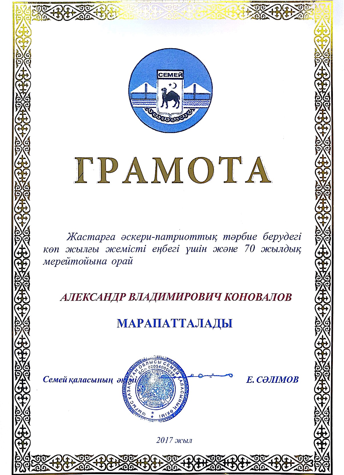 БЛАГОДАРСТВЕННОЕ ПИСЬМО АКИМА ГОРОДА СЕМЕЙ