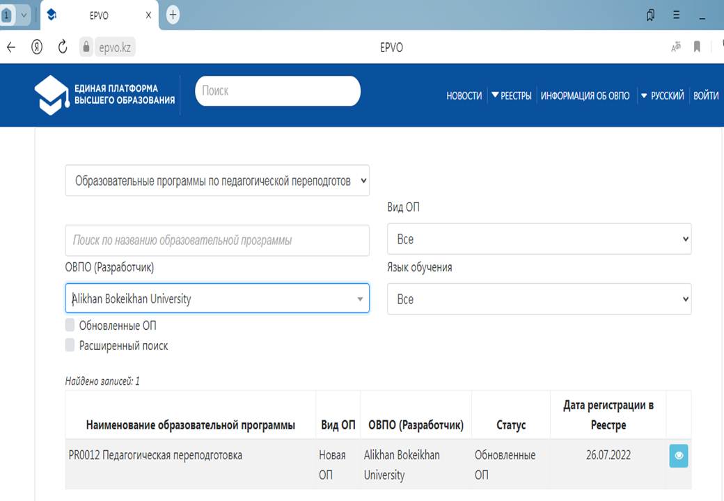 Сведения из Реестра МНВО РК о регистрации ОП PR0012-Педагогическая переподготовка