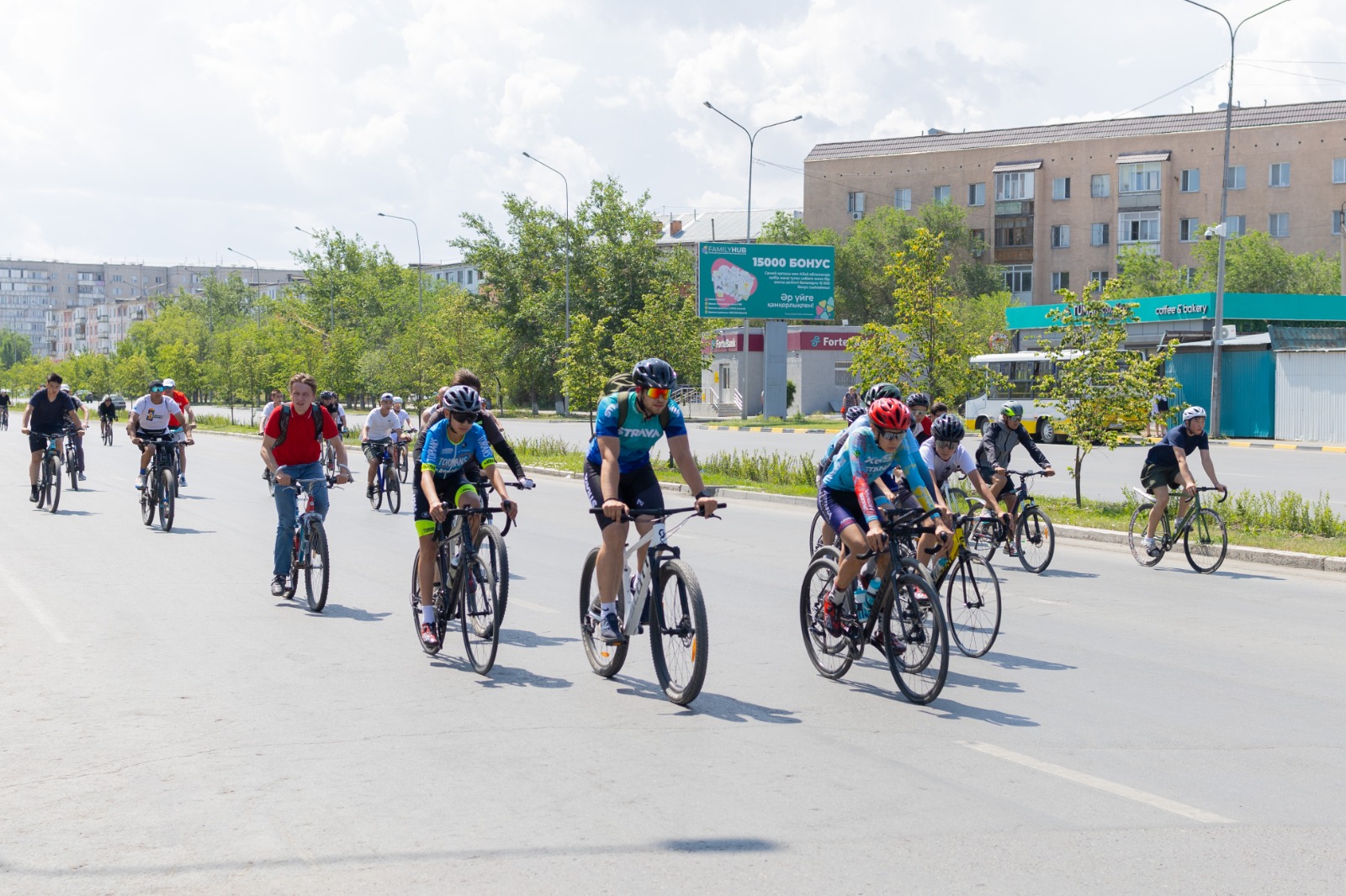 📍 Велопробег стартовал возле ресторана "Тайқазан" и прошёл по проспекту Ауэзова через Городской Дом офицеров до площади Мухтара Ауэзова.