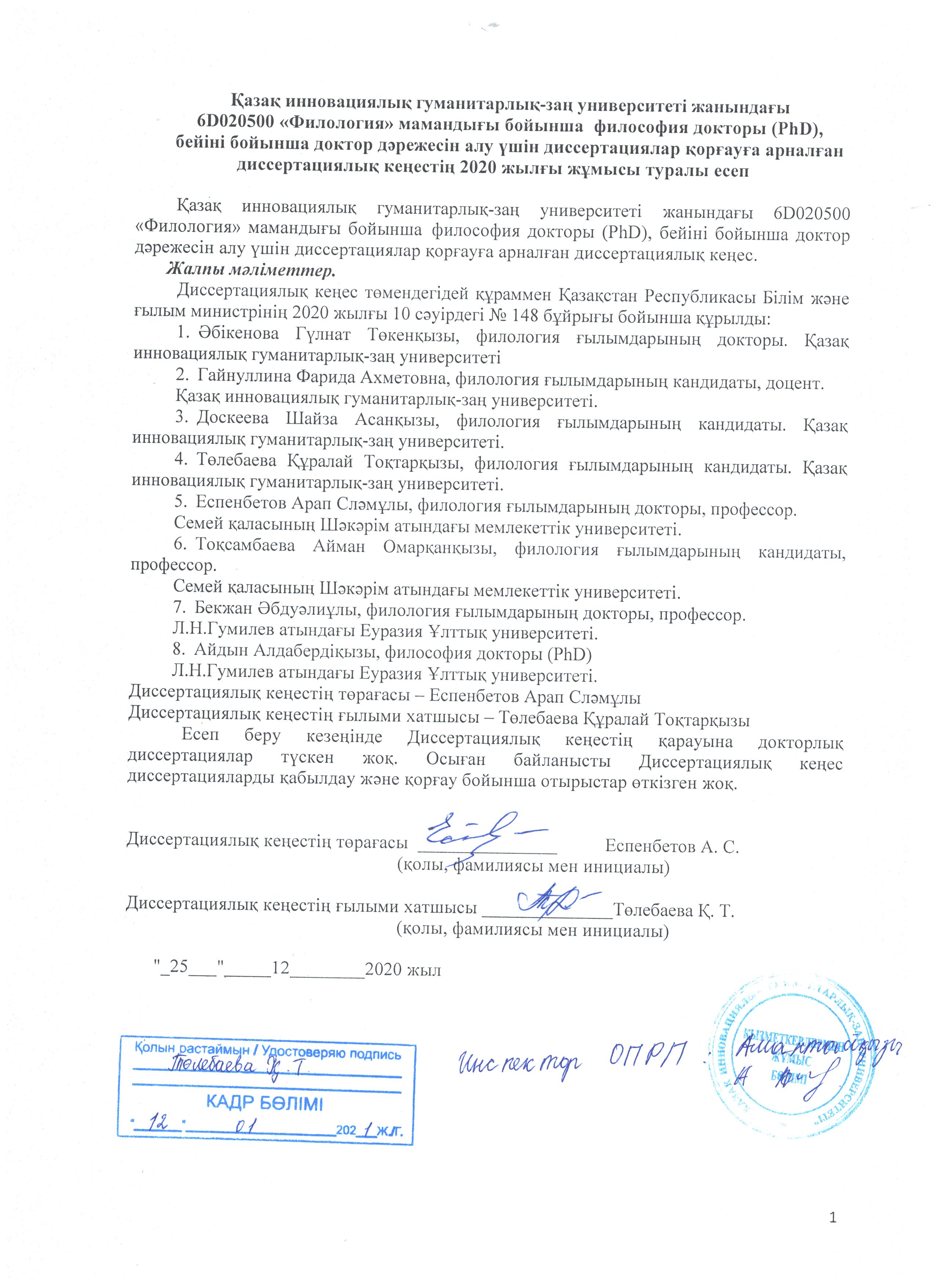 “6D020500 Филология” мамандығы бойынша философия докторы (PhD), бейіні бойынша доктор дәрежесін алу үшін диссертациялар қорғауға арналған диссертациялық кеңестің 2020 жылғы жұмысы туралы есеп