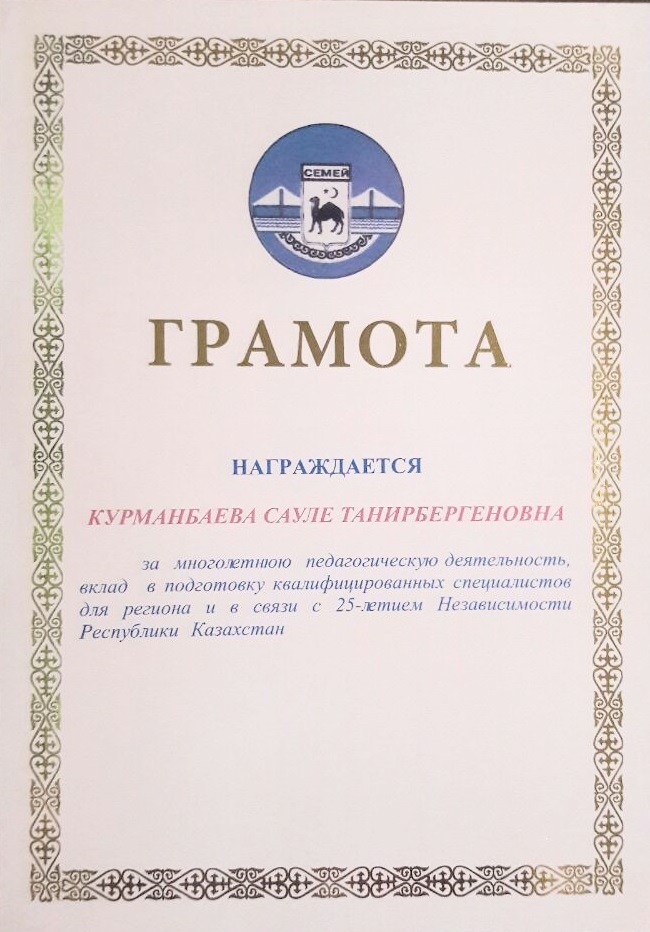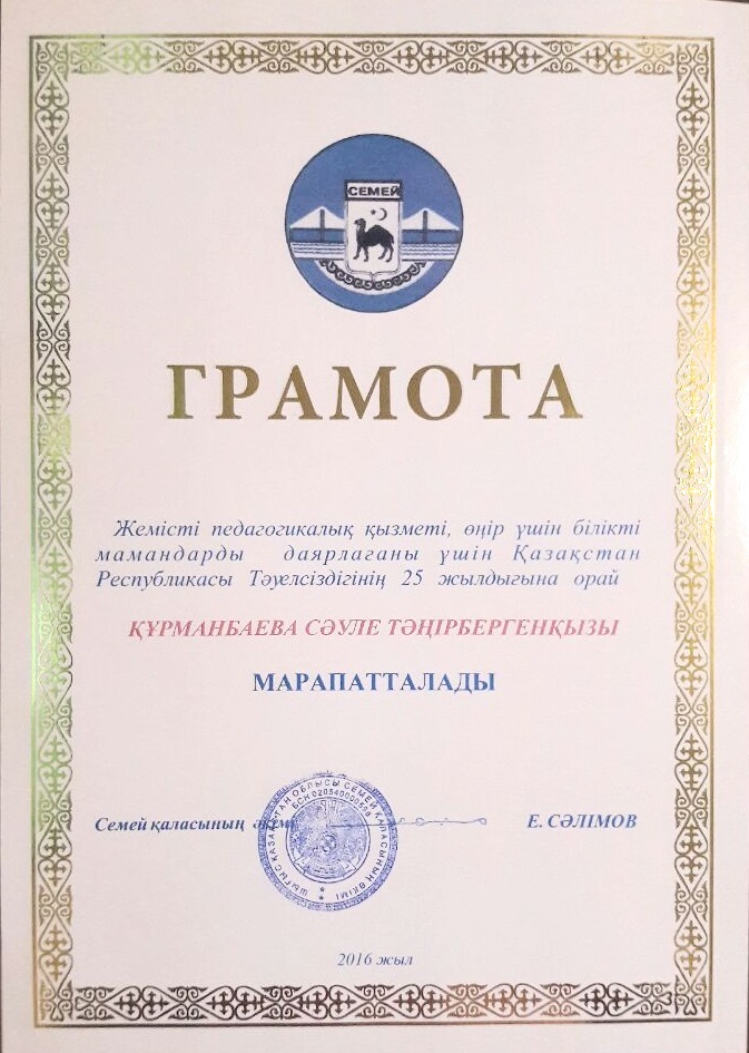 СЕМЕЙ ҚАЛАСЫ ӘКІМІНІҢ АЛҒЫС ХАТЫ
