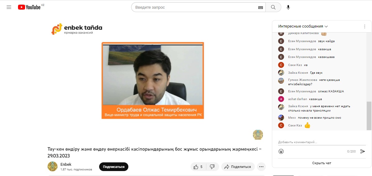 29 наурыз күні ҚР Еңбек және халықты әлеуметтік қорғау вице-министрі Ордабаев Олжас Темірбекұлының қатысуымен Enbek.kz порталында бос жұмыс орындарының республикалық онлайн жәрмеңкесі өтті.